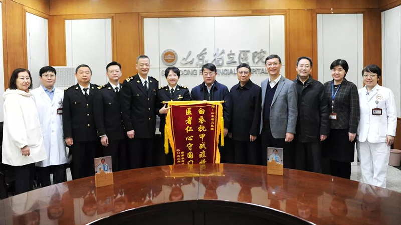 1月12日,济南海关副关长王丽、济南机场海关关长蔡龙一行4人向我院赠送感谢信和锦旗,对我院长期以来派驻工作人员王菲菲、王霞、王振晓协助济南机场海关做好境外人员入境的新冠疫情防控工作表达了感谢,并对队员们忠于职守、无私奉献的敬业精神表示了高度肯定和赞扬。医院党委书记孟冬,党委委员、副院长王荣、孙志坚,医院办公室、疫情防控办公室、医务部、护理部和医学工程管理办公室负责人参加。
