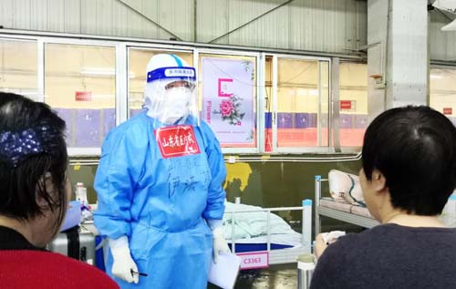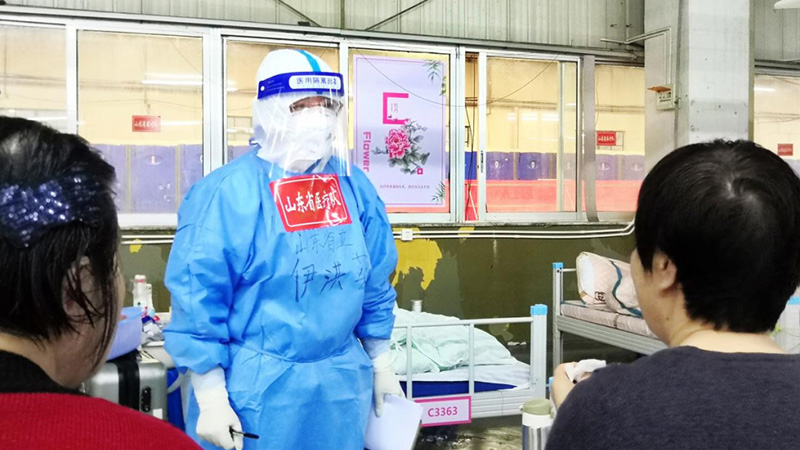 在上海市徐汇区石龙路方舱医院里,来自山东第一医科大学附属省立医院(山东省立医院)的援沪医疗队员伊洪莉,正仔细核对患者的个人信息。在她背后的玻璃窗上,是山东医疗队创意想出的花卉分区贴纸。为了鼓励患者增强信心,早日恢复健康,山东援沪医疗队员集思广益,把方舱医院的5个区域分别以百合、玉兰、牡丹、山茶、丁香进行命名,每一种花卉的下面还有一句名言金句,为方舱营造了良好的人文氛围,舒缓了患者的紧张情绪。