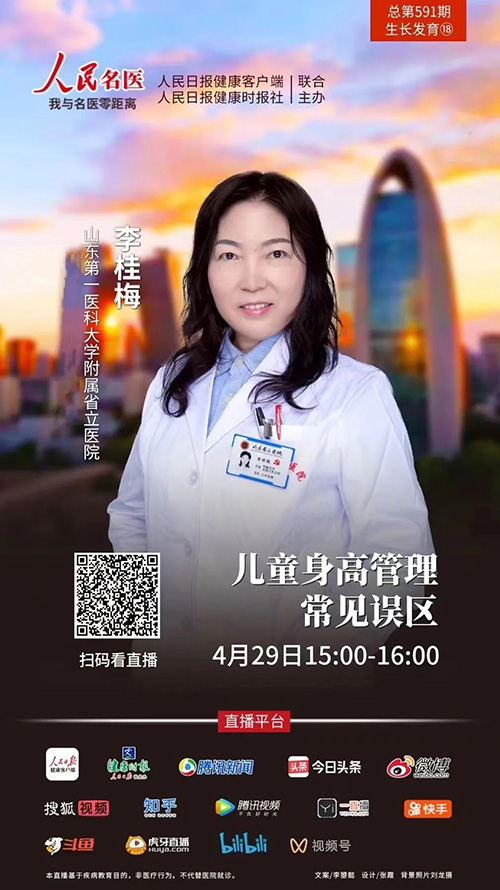 4月29日下午,山东第一医科大学附属省立医院(山东省立医院)儿科李桂梅教授做客“人民名医”节目,进行了《儿童身高管理常见误区》线上直播,并在直播间与线上网友进行了深入交流,回答了网友关切的问题。