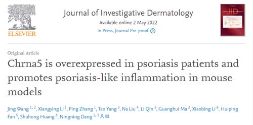 众所周知,烟草中的生物碱-烟碱是吸烟相关疾病的主要致病成分,烟碱进入人体后通过烟碱型乙酰胆碱受体(Chrna)发挥作用。党宁宁课题组在国际上率先发现Chrna5在银屑病患者皮损中高表达,随后作者通过体内外实验和模式动物发现该受体被激活后可致组织发生银屑病样病理生理变化,最后,作者使用银屑病小鼠模型来验证拮抗Chrna5受体是否具有治疗作用,结果表明上述举措可有效消除动物皮损银屑病样的炎症反应。
