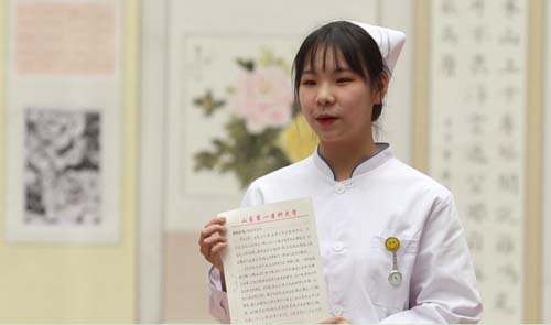 在“5•12”国际护士节前夕,2020级本科的孙兵同学,拿出纸笔,代表同学们给援沪医疗队写信,“尊敬的援沪医疗队队员,你们好,我是山东第一医科大学护理学院的一名学生……学习了山一大援沪医疗队的事迹,我对你们不惧艰险、勇往直前的精神,感到深深地敬佩。正是有像你们这样的英雄在负重前行,守护周全,才有我们的岁月静好……”信中这样写道。