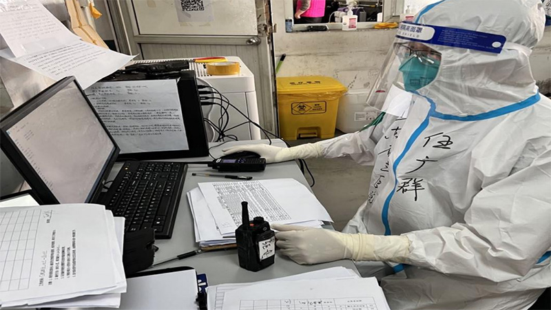 4月3日随队抵达上海后,医疗队多次对队员进行个人防护、核酸采集及急救培训。作为医院急诊科护士及呼吸治疗师,多次参与医院核酸及济南市核酸采集工作的任广群有着丰富的经验,他热切地和队员们分享了采集经验,并重温了相应急救知识。在社区进行采样时,任广群多次被上海市民竖起大拇指,夸赞其采集手法的标准及认真,工作人员对他的工作给予高度肯定。任广群在完成两个核酸采样点工作后,又不辞辛苦支援其他采样点,直至15:00全部战友结束任务。当日上海天气炎热,任广群密闭的防护服内隔离衣被汗水浸透,但整个采样过程中,任广群没有丝毫懈怠,说得最多的话就是“谢谢,不辛苦”。
