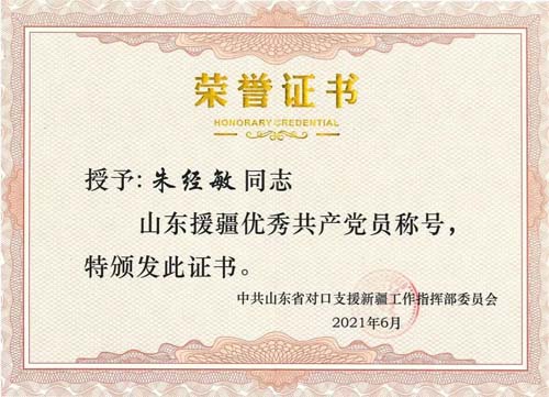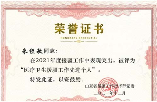 援疆以来,他始终牢记组织嘱托,牢记援疆使命,提升工作本领,自我加压,主动作为,受到了同事和当地群众的一致肯定和好评。因工作成绩突出,转为第十批援疆人才继续援疆工作,并先后获得援疆专家“健康卫士”、山东援疆优秀共产党员、山东优秀援疆人才、医疗卫生援疆工作先进个人等荣誉称号。