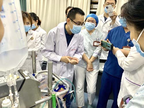 重症医学一科蒋进皎教授主持培训,介绍了目前ECMO治疗的前沿概况,并用实例讲解了ECMO技术的难点。院内首批ECMO培训师资唐跃、张琳主治医师进行理论授课。唐跃主治医师、张斯斯护师进行实操技能授课。蒋进皎教授、唐跃主治医师还就学员在实际工作中遇到的临床问题给予了详细解答。