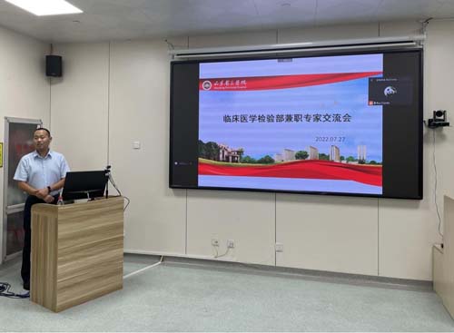 7月27日下午,临床医学检验部于济南饭店三号楼二楼会议室召开兼职专家交流会,会议采取线上方式与东院检验科连线进行,两院区各科室主任及硕博士、业务骨干参会,会议由临床医学检验部副主任王允山主持。