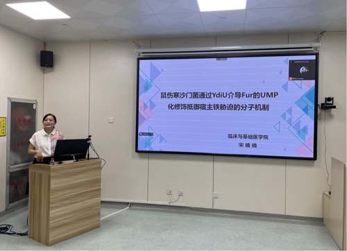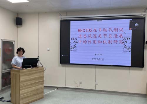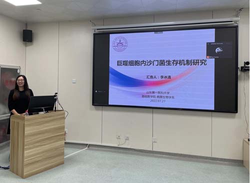 山东第一医科大学基础医学院李冰清教授就《巨噬细胞内沙门菌生存机制》作学术报告、宋楠楠教授就《鼠伤寒沙门菌通过YdiU介导Fur的UMP化修饰抵御宿主铁胁迫的分子机制》作学术报告、宋冠华教授就《HECTD2多胺代谢促进类风湿关节炎进展中的作用和机制研究》作学术报告,随后几位教授与检验部各位参会主任及业务骨干进行学术交流。