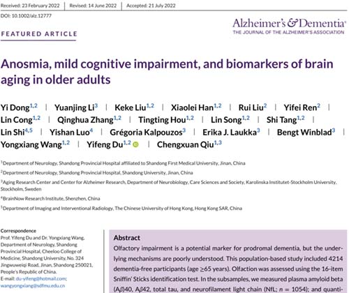 2022年9月,山东第一医科大学附属省立医院(山东省立医院)杜怡峰教授团队在国际痴呆研究顶级期刊《Alzheimer's & Dementia: The Journal of the Alzheimer's Association》(IF:16.655)杂志在线发表了题为“Anosmia, mild cognitive impairment, and biomarkers of brain aging in older adults”的论著。省立医院神经内科董艺博士为第一作者,杜怡峰教授和王永祥副主任医师为通讯作者。