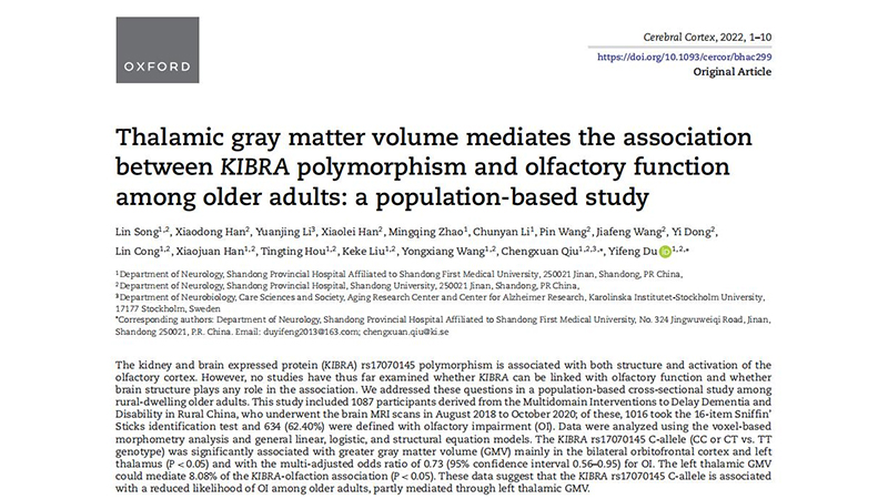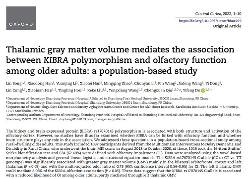 近日,山东第一医科大学附属省立医院(山东省立医院)杜怡峰教授团队在神经科学领域TOP期刊《Cerebral Cortex》上发表了题为“Thalamic gray matter volume mediates the association between KIBRA polymorphism and olfactory function among older adults: a population-based study”的研究论文。本研究论文第一作者为山东第一医科大学附属省立医院神经内科青年泰山学者宋林副教授,通讯作者为杜怡峰教授和瑞典卡罗琳斯卡医学院仇成轩教授。