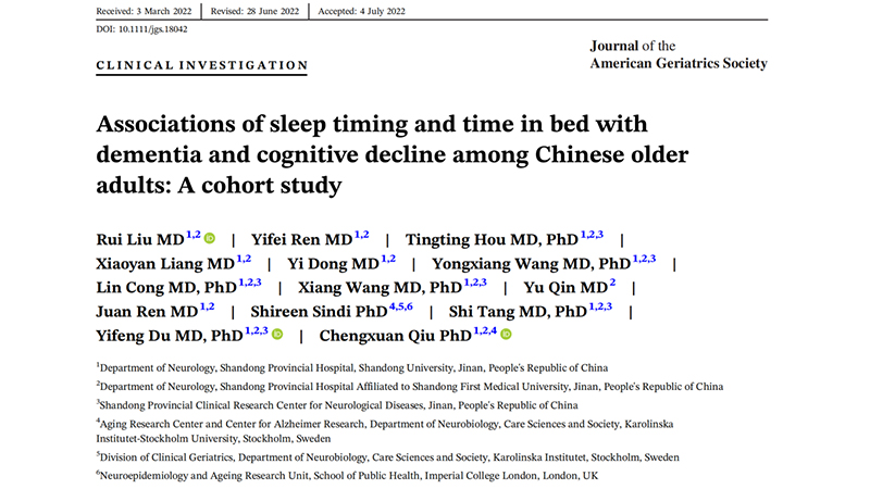 近日,山东第一医科大学附属省立医院(山东省立医院)杜怡峰教授团队在国际老年医学研究著名期刊《Journal of the American Geriatrics Society》(中科院1区Top)在线发表了题为“Associations of sleep timing and time in bed with dementia and cognitive decline among Chinese older adults: A cohort study”的研究论文,阐述了老年人睡眠时相和卧床时长等特征与全因痴呆和阿尔茨海默病发病风险的相关性。省立医院神经内科博士研究生刘蕊为第一作者,杜怡峰教授、唐诗副教授为通讯作者。《Journal of the American Geriatrics Society》期刊为该论文撰写了“Editor’s Note”。