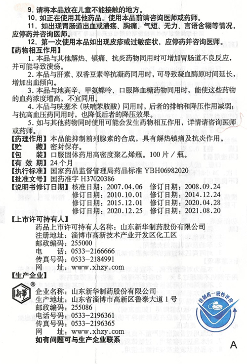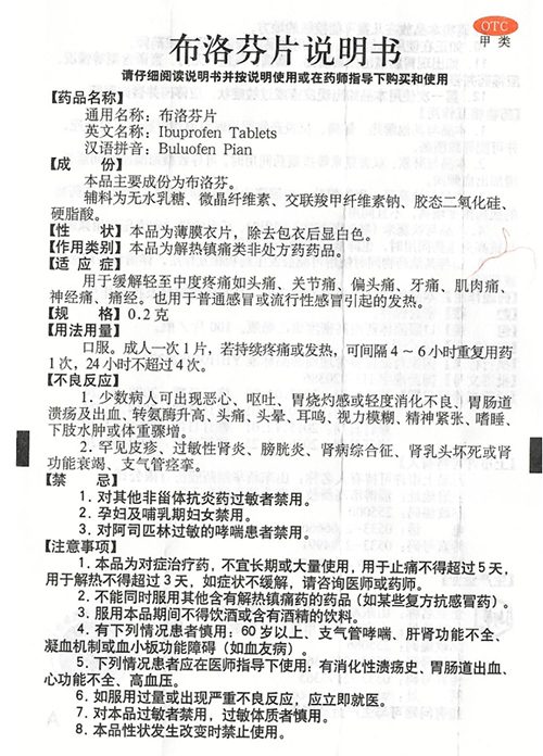 布洛芬片(0.2g*100片/瓶,山东新华制药股份有限公司)分装使用,说明书如下