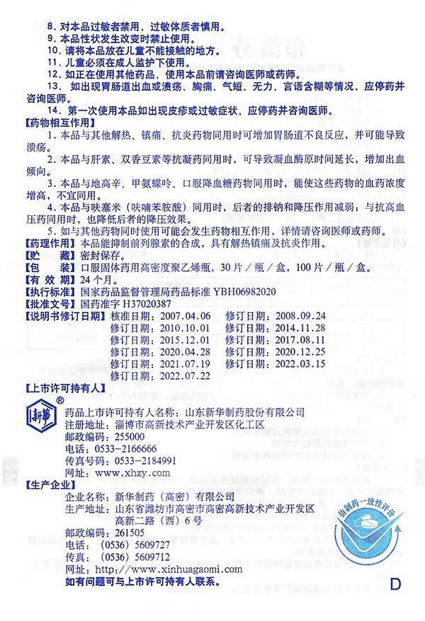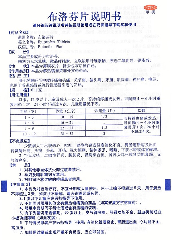 布洛芬片(0.1g*100片/瓶,山东新华制药股份有限公司)分装使用,说明书如下
