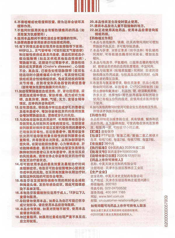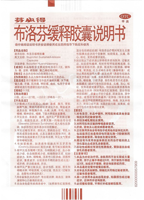 芬必得(布洛芬缓释胶囊)(0.3g*10粒/2板/盒,中美天津史克制药有限公司)分装使用,说明书如下