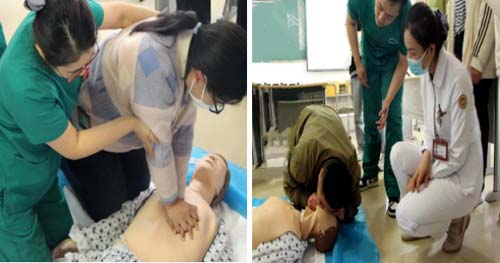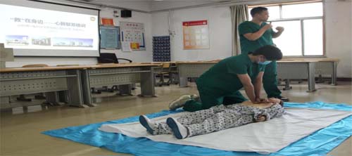 在应急救护实操环节,教学组成员孙恒和姜志成通过人体模型详细演示心肺复苏步骤。同学们认真观摩,学习气氛热烈。演示结束后,同学们热情高涨,积极参与体验心肺复苏,教学团队对同学们进行操作要领手把手现场指导。
