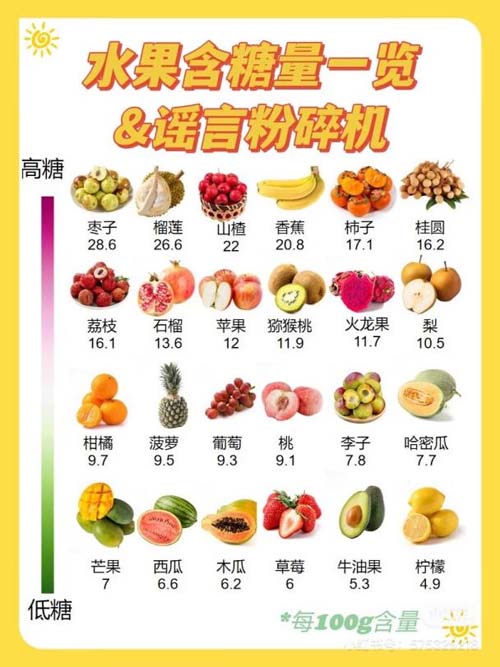 水果的种类很重要,因为各种水果碳水化合物的含量为6%~20%,糖尿病朋友应该选择含糖量相对较低或者升高血糖速度较慢的水果。100克水果中含糖量在10克以下的水果有青梅、西瓜、柠檬等,这一类水果糖尿病朋友们可以放心选择。100克水果中含糖量在10~20克的水果有石榴、橘子、苹果、梨、荔枝等,要在血糖控制平稳的时候适量摄入。含糖量超过20克的水果有枣、香蕉等,特别是干枣、柿饼、葡萄干、杏干、桂圆等的果干,含糖量极高,糖尿病朋友要禁止食用。每100克水果含糖量对比见下图。