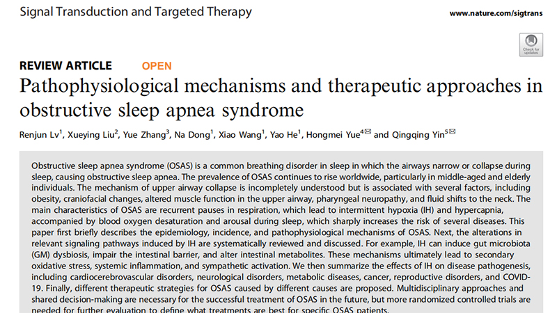 近日,我院老年神经内科殷青青副教授在Nature子刊《Signal Transduction and Targeted Therapy》(中科院1区Top,影响因子:38.12)发表了题为“Pathophysiological mechanisms and therapeutic approaches in obstructive sleep apnea syndrome”的重要综述论文。第一作者为我院老年医学科硕士研究生吕仁君。