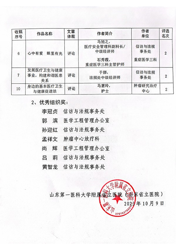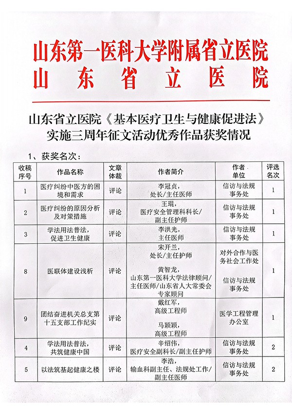 山东省立医院《基本医疗卫生与健康促进法》实施三周年征文活动优秀作品获奖情况