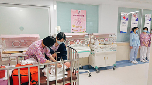 科室模拟一个住满患儿的监护房间,因电源线老化致设备带迅速起火的场景,责任护士发现设备冒出火星并着火立即大声呼叫周围在岗人员,灭火小组人员立即按下消防报警器报警,迅速提出灭火器,手提喷头对准火源根部灭火;转运小组人员立即到达着火房间,快速将患儿及暖箱通过就近的疏散通道转移到避难间,同时,应急协调组人员立即通知科主任及护士长,并拨打保卫部电话报警。