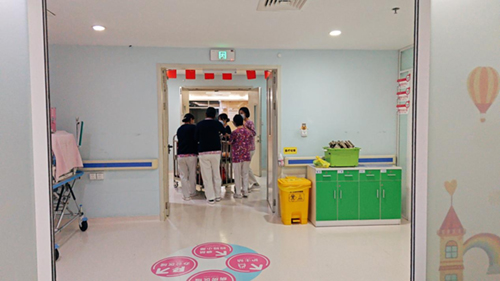 经手提灭火器初步灭火后,火势未见减小,立即使用消防卷盘双人配合进行灭火,火势仍未得到控制,此时保卫部消防控制中心人员到达,协助进行灭火,并下达全员紧急撤离的通知。所有在岗人员立即到达各自分区,快速有序地识别患儿身份后包裹患儿,采用科室特别定制的应急疏散车快速将全科患儿撤离至避难间,科主任及护士长指挥引导现场其他人员通过消防通道、安全出口有序撤离。