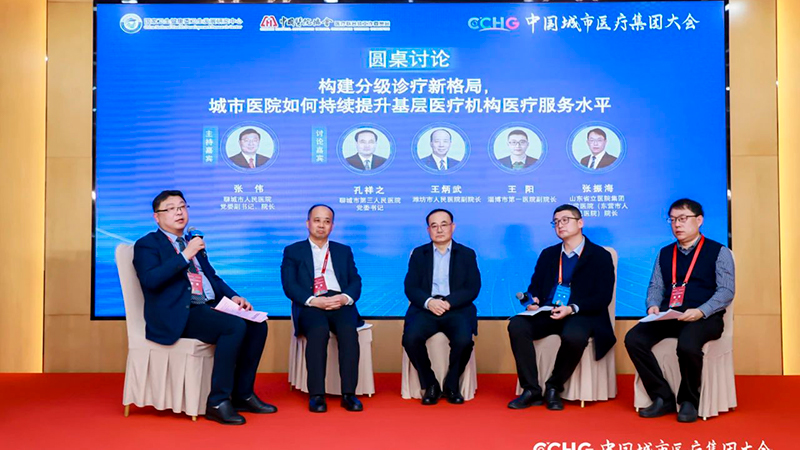论坛举行“构建分级诊疗新格局,城市医院如何持续提升基层医疗机构医疗服务水平”讨论,聊城市人民医院党委副书记、院长张伟主持讨论,山东省立医院集团东营医院院长张振海、聊城市第三人民医院党委书记孔祥之、淄博市第一医院副院长王阳、潍坊市人民医院副院长王炳武参加讨论进行经验分享。