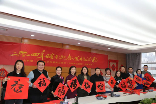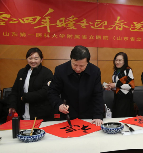 “九州日丽迎新岁,四海龙吟乐大年”,2月4日,山东第一医科大学附属省立医院(山东省立医院)工会和书画协会共同举办“2024年暖冬迎春送福”活动。我院书法爱好者挥毫泼墨、现场创作,为广大职工送“福”到家。医院党委副书记姜民杰、工会主席董华参加活动。
