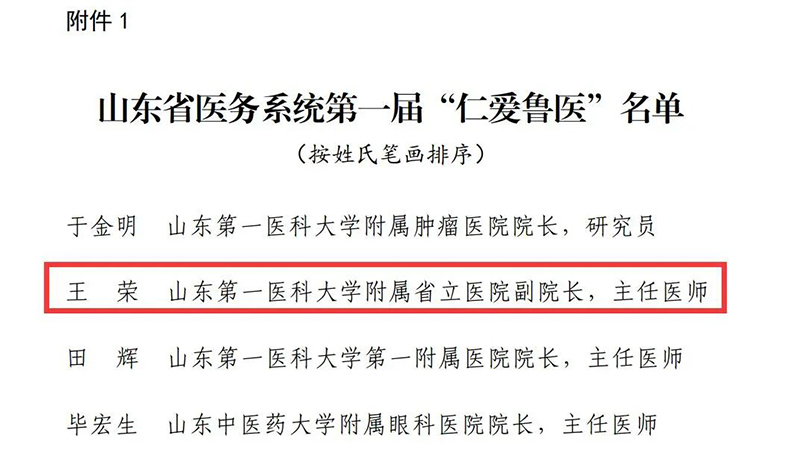 近日,山东省医务工会发布了《关于公布山东省医务系统第一届“仁爱鲁医”第四届“鲁卫工匠”的通知》,我院党委委员、副院长,肾内科主任王荣教授荣获山东省医务系统第一届“仁爱鲁医”荣誉称号。