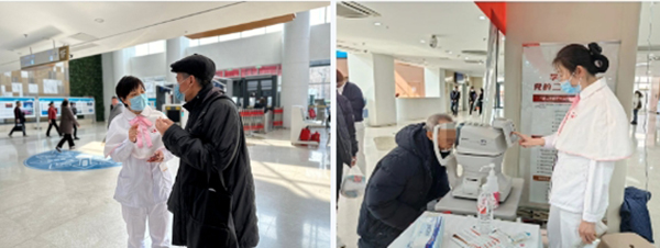 义诊活动现场,眼科张晗主任、马鲁新副主任、眼科青光眼专业组组长申家泉教授以及科室医务人员为前来咨询问诊的群众答疑解惑,提出诊疗建议,并向他们科普青光眼的发病原因、治疗方法以及定期监测和复查的重要性。活动现场还开展了青光眼免费筛查活动,现场为群众测量眼压,进行眼部检查,发放青光眼知识宣传手册,引导群众树立爱眼护眼的意识,强化青光眼防治的认知。