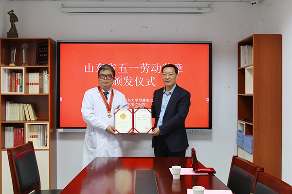 近日,山东省总工会决定授予山东第一医科大学附属省立医院(山东省立医院)口腔科主任张东升山东省五一劳动奖章。4月29日,我院举行山东省五一劳动奖章颁发仪式,校(院)党委副书记、省立医院党委书记吴向东为张东升颁发奖章和证书,党委委员、副院长肖伟参加颁发仪式。
