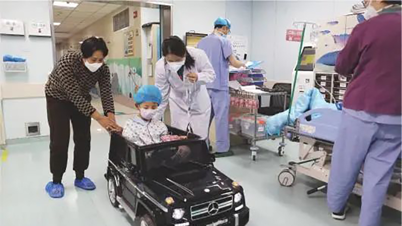 省立医院中心院区手术室“小英雄能量站”,刘玉丛(左三)陪伴一位等待手术的孩子开电动玩具车,以缓解孩子和家长的紧张情绪。