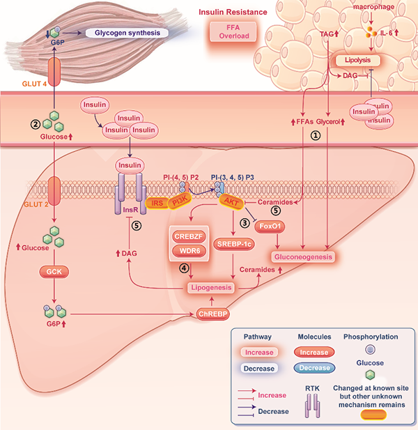 胰岛素抵抗状态下,多种因素影响肝脏脂质沉积,可归纳为3种途径。首先,脂肪组织的脂肪储存能力。胰岛素抵抗导致脂解不受抑制,脂肪储存能力受损,巨噬细胞产生的白介素-6(IL-6)水平升高也会导致脂解速率增加。游离脂肪酸(FFAs)和甘油溢出到肝脏,促进肝糖输出(①)。第二,胰岛素抵抗导致骨骼肌葡萄糖摄取和糖原合成能力降低,蛋白合成减少。肌肉质量减少也降低其糖摄取和糖原合成能力,导致血糖升高,流入肝细胞,并通过GCK和ChREBP促进肝脂合成(②)。第三,胰岛素对肝脏脂肪酸合成的直接作用,包括通过INSR/IRS/AKT/mTORC1/SREBP-1c等已确认的“经典”胰岛素信号传导(③)和肝脏“选择性”胰岛素信号传导的机制,包括通过CREBZF或WDR6(④)等途径,尚待完全阐明。此外,肝脂质紊乱导致有毒脂质中间产物(DAG、鞘氨醇、ROS等)水平升高,可能导致胰岛素信号传导受损和炎症(⑤)。总的来说,尽管它们可能以不同程度对肝脂沉积作出贡献,但这些途径可能在胰岛素抵抗状态下共存,并加剧肝脂质沉积的发展。