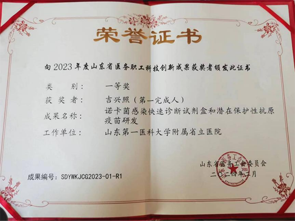 日前,山东省医务工会委员会发布了《关于公布2023 年度山东省医务系统职工科技创新优秀成果的通知》,经专家评审研究、公示,山东第一医科大学附属省立医院(山东省立医院)呼吸与危重症医学科吉兴照等申报的《诺卡菌感染快速诊断试剂盒和潜在保护性抗原疫苗研发》,荣获 2023 年度山东省医务系统职工科技创新成果一等奖。