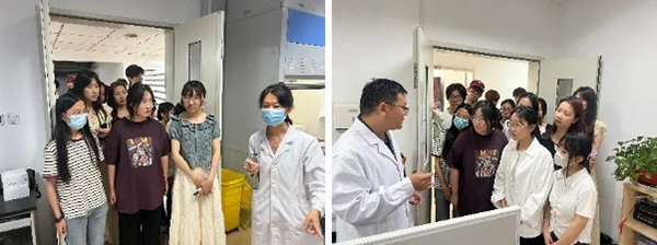 学生们在病理科工作人员的带领下参观了病理科,了解了科室基本布局及工作流程,并应用多头显微镜观察了肿瘤切片,对微观世界的肿瘤形态和生长方式有了感性认识。