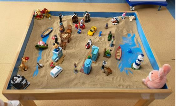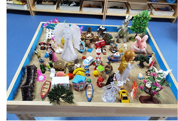 学习初期以减压为主,学员们离开家乡来到陌生环境,彼此之间不熟悉,大家借助沙盘游戏将自己的“心相”视觉化、具体化,使潜意识的问题得以呈现。通过对沙具、沙盘命名及讲解,大家倾诉了自己当下的压力、困境与感受,交流了解决当前问题的方法和途径,疏解了情绪与压力。