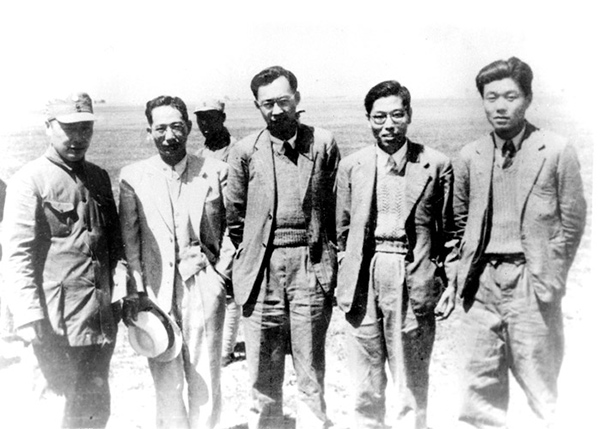 解放战争前夕,我院张学彬(右二)等四位医生由重庆辗转至解放区, 在临沂机场受到陈毅(左一)的亲切接见