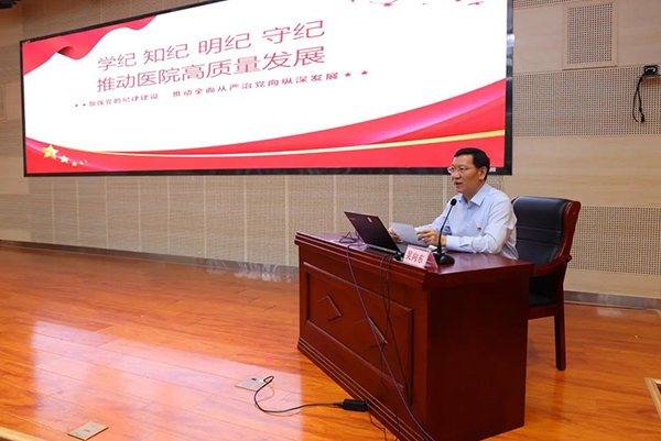 吴向东书记强调,严明纪律规矩是我们党的优良传统和政治优势,党的十八大以来,以习近平同志为核心的党中央始终把纪律建设放在更加突出的位置。严明的纪律规矩对医院党的建设和高质量发展均起着举足轻重的作用。医院党员干部职工要把党纪学习教育作为重要政治任务,认真学习《中国共产党纪律处分条例》,严格遵守党的政治纪律、组织纪律、廉洁纪律、群众纪律、工作纪律、生活纪律,切实把自己摆进去、把工作摆进去、把职责摆进去,强化自我约束,促进担当作为,在医院高质量发展新征程上统一思想、统一意志、统一行动。