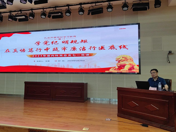 6月28日下午,山东第一医科大学附属省立医院(山东省立医院)内科党总支开展党纪学习教育专题党课。医院党委委员、副院长王荣,内科总支书记王晓晖为内科党总支党员讲授专题党课,内科党总支全体支部书记及党员代表参加学习。