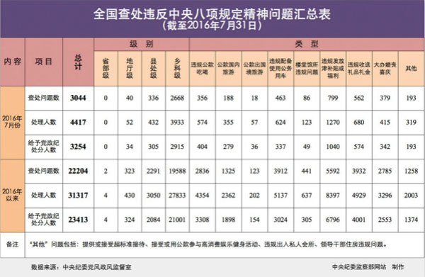 为掌握全国贯彻落实中央八项规定精神情况,中央纪委在31个省区市和新疆生产建设兵团、139个中央和国家机关、106个中央企业、15个中央金融企业建立了落实中央八项规定精神情况月报制度。2016年以来,截至7月31日,全国查处违反中央八项规定精神问题情况如下: