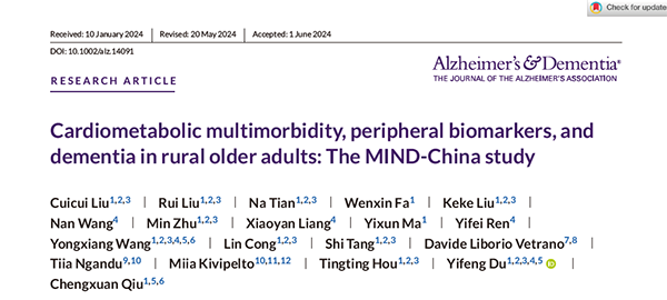 近日,山东第一医科大学附属省立医院(山东省立医院)杜怡峰教授团队在国际痴呆研究领域著名期刊《Alzheimer's & Dementia: The Journal of the Alzheimer's Association》(中科院1区 Top,IF:13.0)在线发表了题为“Cardiometabolic multimorbidity, peripheral biomarkers, and dementia in rural older adults: The MIND-China study”的研究论文(全文:https://alz-journals.onlinelibrary.wiley.com/doi/10.1002/alz.14091)。本研究论文第一作者为山东第一医科大学附属省立医院神经内科刘翠翠主治医师,通讯作者为杜怡峰教授和侯婷婷副教授。
