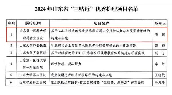 山东第一医科大学附属省立医院获评2024年山东省“三贴近”优秀护理项目