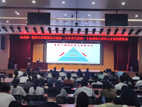于金明院士以《立鸿鹄之志 做足下文章》为题为青年人才作报告,他从胸怀格局、拼搏精神、创新思维、团结自省等方面深入展开,结合自身奋斗经历和多个生动的励志故事,分析了成才和成功的基本条件,他认为医护人员要学会与患者换位思考,专注专业,深入钻研,深入践行医疗职业精神,在反哺反馈中知足,在工作事业创新中知不足,更要在个人事业发展中不满足,要在严守医护人员道德操守的基础上,锲而不舍、全力拼搏,努力提升临床诊疗水平和科研能力,在人生赛道上跑出卓越与辉煌。