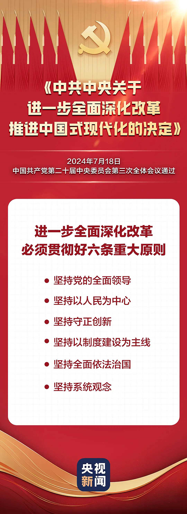 《决定》提出,进一步全面深化改革,必须贯彻好六条原则。