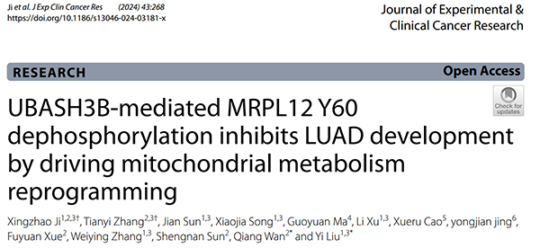 在《Journal of Experimental & Clinical Cancer Research》(中国科学院分区1区TOP期刊,影响因子IF=11.4)上,刘毅教授团队发表了题为“UBASH3B-mediated MRPL12 Y60 dephosphorylation inhibits LUAD development by driving mitochondrial metabolism reprogramming”的研究论文。该研究深入剖析了MRPL12介导的线粒体代谢重编程在肺腺癌发展过程中的关键作用,为肺腺癌的精准干预提供了新的治疗靶点。该研究成果由省立医院吉兴照副教授与张天一硕士研究生为共同第一作者,刘毅教授与完强教授为共同通讯作者。