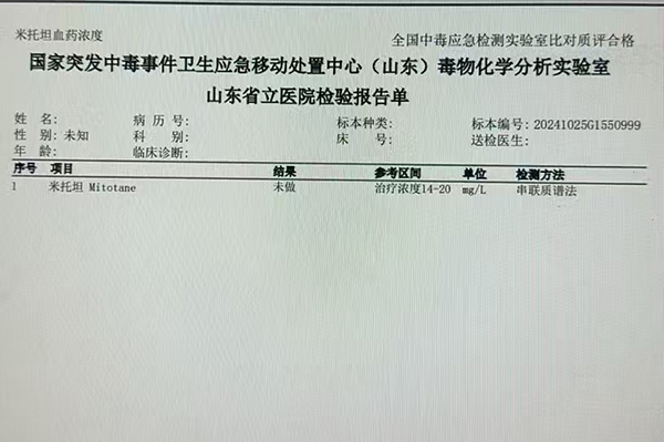 由医院承建的国家突发中毒事件卫生应急移动处置中心(山东)建立的米托坦TDM方法学仅需采血量1ml,成功实现了对患者血浆中米托坦药物浓度的高灵敏度和高特异性监测,这一创新技术的应用填补了省内空白,为今后我省肾上腺皮质癌罕见肿瘤患者的药物治疗提供了技术支持。