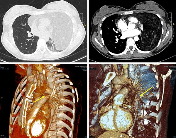 胸部增强CT示:前中纵隔及左侧胸腔可见巨大混杂密度肿块,最大截面约16.9x13.21cm,包绕心脏,升主动脉及肺动脉。血管重建示异常动静脉血供来源(黄色箭头指示)。