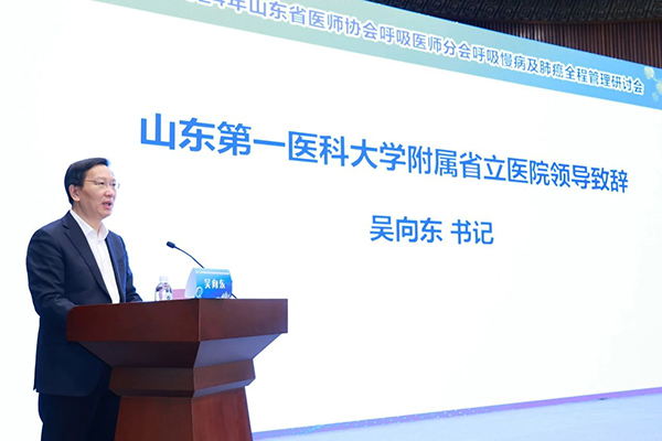 吴向东书记在致辞中介绍了省立医院近年发展成就。他表示,呼吸与危重症医学科作为山东省内首批医药卫生重点学科、临床重点专科,获评国家级PCCM专科医师培训基地、国家级住院医师规范化培训基地、中国医师协会呼吸内镜医师培训基地、中国肺癌防治联盟肺结节诊治分中心等,拥有一批全国知名专家以及一支医德高尚、人才结构合理、专业技能精湛、创新进取的学科团队,赢得了省内外专家和患者的广泛认可。在当今医学领域,呼吸慢病和肺癌已成为严重威胁人类健康的重大疾病。本次研讨会的召开,搭建了呼吸慢病及肺癌交流与合作的平台,共同探讨呼吸慢病及肺癌全程管理的最新理念、最佳实践和前沿技术。