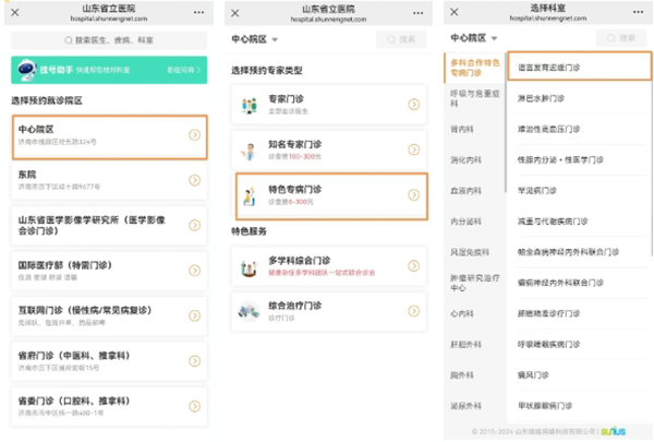 为方便广大患儿及家属就诊,患儿家属可通过医院官方微信公众号进行线上预约,预约流程:进入山东省立医院微信公众号“预约挂号”→“中心院区”→ “特色专病门诊”→“多科合作特色专病门诊”→“语言发育迟缓门诊”进行预约挂号。