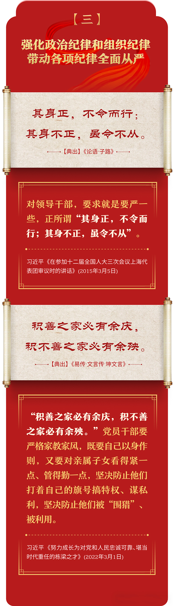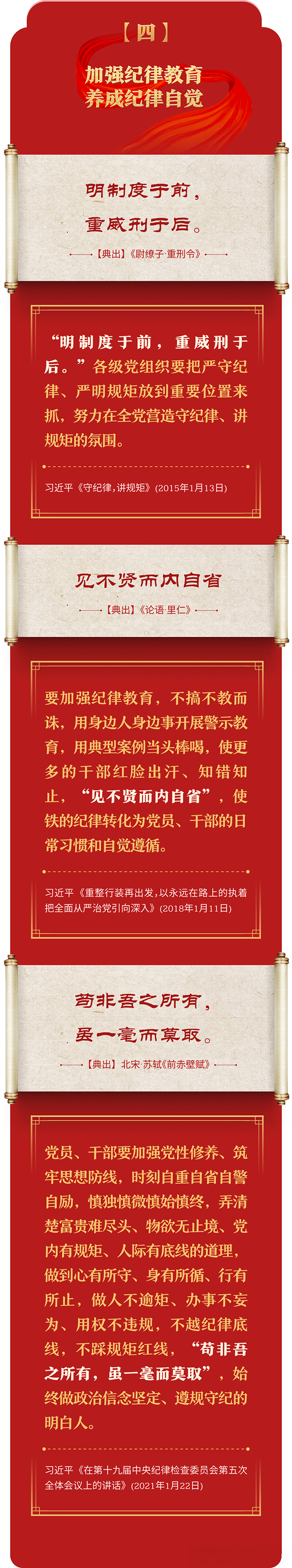 加强纪律建设是全面从严治党的治本之策。党的十八大以来,习近平总书记围绕全面加强党的纪律建设发表一系列重要论述,立意高远,内涵丰富,思想深刻,引导党员干部学纪、知纪、明纪、守纪,真正把纪律规矩转化为政治自觉、思想自觉、行动自觉,确保全党目标一致、团结一致、步调一致。在这些重要论述中,总书记精妙运用古代典籍经典名句,以古喻今、启迪思想、激荡精神,让我们一起来学习!