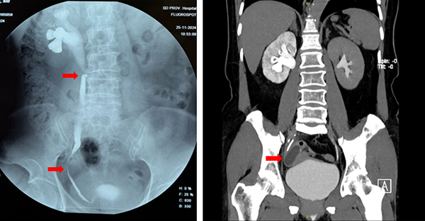 解女士因反复右下腹疼痛不适2年,曾于外院行输尿管镜检查,术中发现右侧输尿管下端明显狭窄,输尿管镜难以进入,无法进一步诊断和治疗。右下腹疼痛不适一直困扰着解女士,导致她无法正常工作和生活,慕名到院就诊。入院后,专家询问病史发现解女士既往曾两次行右侧卵巢手术,进行泌尿系增强CTU检查,结果显示右侧附件区见一类圆形无强化低密度囊性灶,截面约4.6*3.2cm,邻近右侧输尿管受压狭窄,其上游输尿管及右侧肾盂积水扩张。尿路逆行造影检查显示右输尿管两处狭窄:上段输尿管迂曲狭窄;下段输尿管可见因右侧附件区囊性肿物压迫导致狭窄。