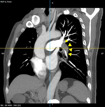 患者前期接受了牙龈癌腓骨取瓣移植术,术后卧床休息,突然出现左下肢明显肿胀,入厕后晕厥,救护车送入医院急救中心。入院时患者胸闷不适,收缩压小于100mmHg,心率增快。医院完善各项检查后进一步明确诊断为左肺大面积肺栓塞、左下肢深静脉血栓形成(混合型)。