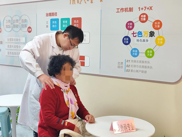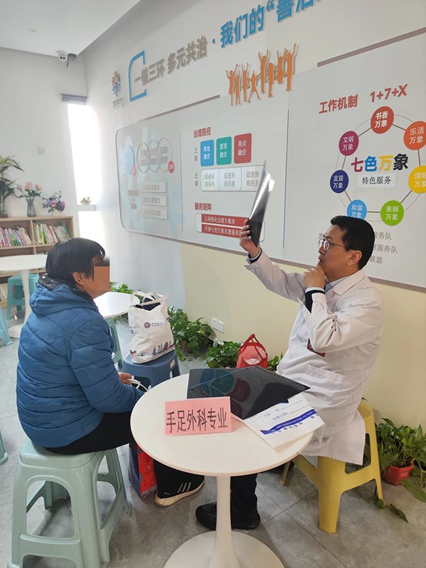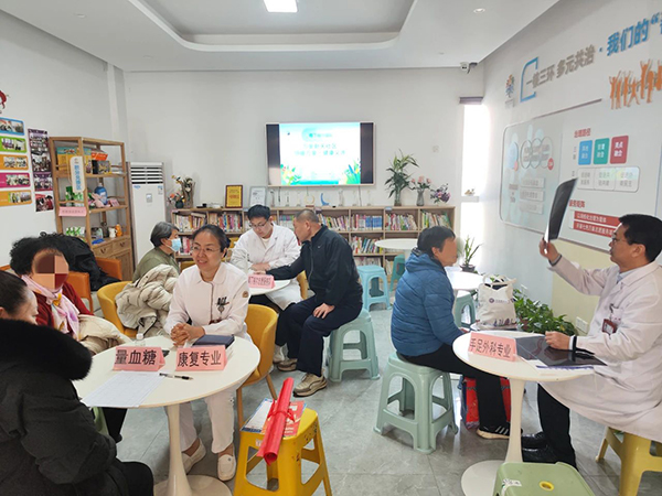 义诊活动现场,手足与显微重建外科奥体院区一病区主任官士兵等专家就社区居民提出手足部疾病问题,耐心讲解,就老年人存在的慢性病、多发病、常见病提出预防和治疗建议。护理人员为社区居民测量血糖和血压,并针对用药安全以及高血压、糖尿病、骨质疏松等老年疾病进行健康指导。