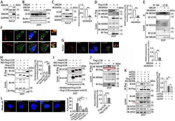 在本研究中,作者发现衰老小鼠皮肤中自噬相关蛋白LC3B表达异常,同时Neddylation修饰的E2酶UBE2M蛋白水平降低。Ube2m基因敲除小鼠皮肤具有明显的衰老表型,并伴有自噬功能紊乱。进一步研究发现,LC3B可在UBE2M的作用下发生Neddylation修饰, CUL2-RBX1和CUL4B-RBX1是催化该修饰的E3连接酶。LC3B的K42位点被确定为其主要的Neddylation修饰位点,且LC3B正常的核质穿梭与脂化是其发生Neddylation修饰的前提条件。机制研究显示,LC3B的Neddylation修饰能够拮抗其泛素化修饰,抑制其泛素-蛋白酶体降解,从而稳定细胞自噬功能。最后研究发现,在小鼠皮肤和人角质形成细胞中敲低UBE2M所引起的衰老表型,可通过回补LC3B得到明显缓解。